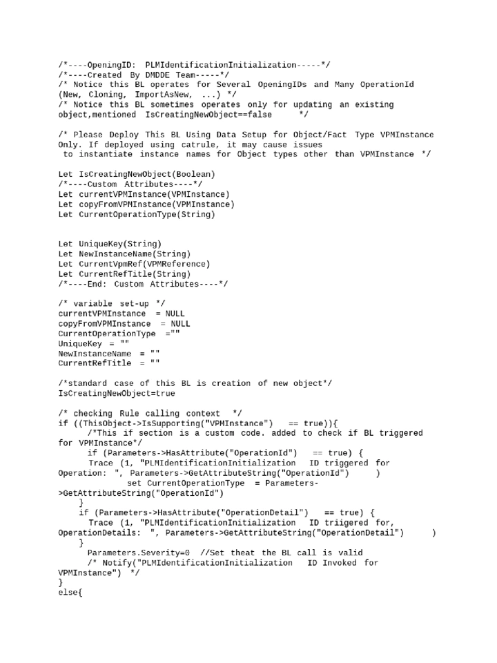 Important Note:  The Opening ID "PLMIdentificationInitialization" gets triggered when any type of PLM Object is created (New, Clone or other operations). When the Opening ID "PLMIdentificationInitialization" gets triggered, it tries to find the BL "PLMIdentificationInitialization.CATRule" in the "3DExperience_Installation\\win_b64\\resources\\knowledge\\scripts" folder. If the BL is not available, it goes for type specific BLs to manage the Attributes Initialization. For example, BL "ENONT_VPMReference_BLInitialization.CATRule" is called for "VPMReference". However, if the BL "PLMIdentificationInitialization.CATRule" is available in "3DExperience_Installation\\win_b64\\resources\\knowledge\\scripts", then it gets called for each type of PLM object after creation and does not go to type specific Attribute Initialization BLs.