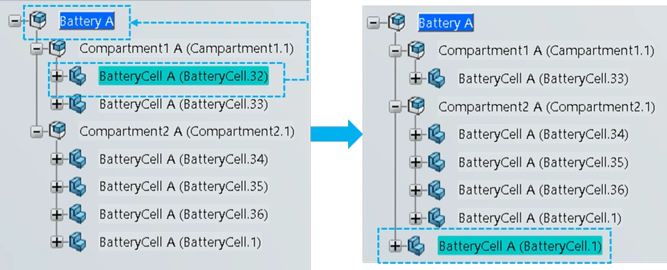 Similarly, if the 3DPart "BatteryCell.32" is moved under the root "Battery", it will be renamed to ""BatteryCell.1"