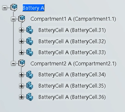 Also, if the 3DPart "BatteryCell.32" is dragged and dropped under the root "Battery", then also it's "Instance Name" will be kept as it is.