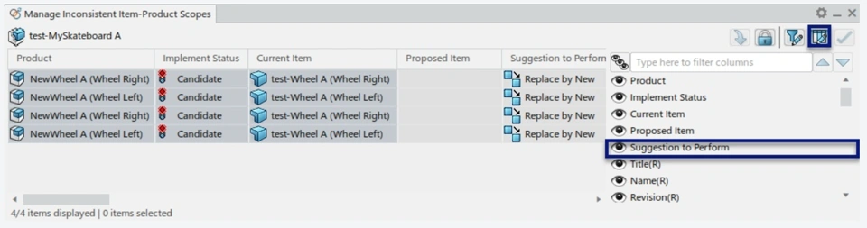 UsageCustomize the ‘Suggestion to Perform’ column of the ‘Manage Inconsistent Item-Product Scopes’ panel (for ‘Manage Inconsistent Item-Product Scopes’ command).