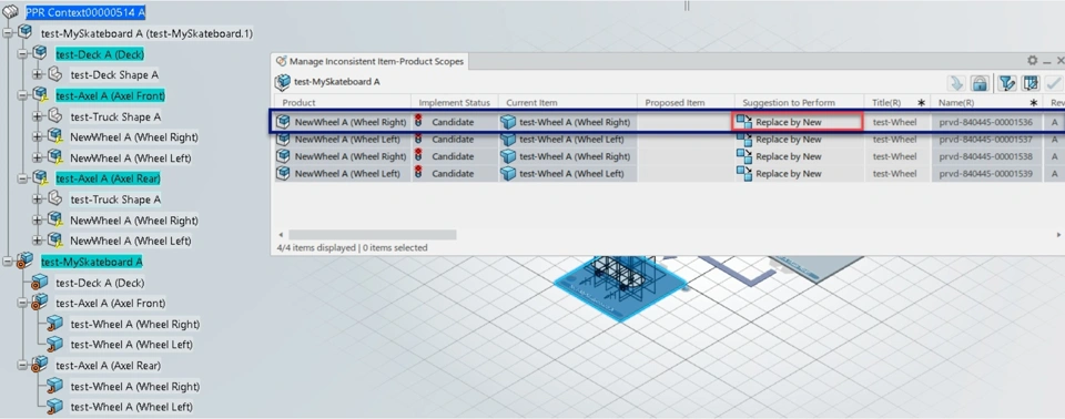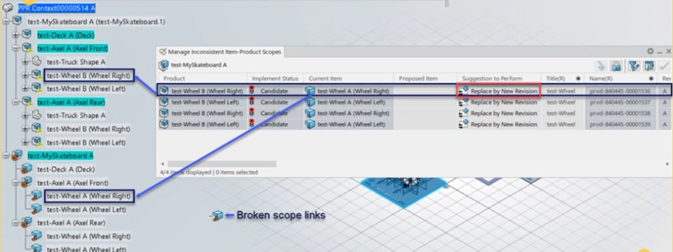 Here, the scope links were present between Eng. Item ‘test-Wheel A’ and Mfg. item ‘test-Wheel A’. Eng. Item ‘test-Wheel A’ is replaced (all four instances in EBOM) by a completely new Eng. item ‘NewWheel A’ hence the scope links between Eng. Item ‘test-Wheel A’ and Mfg. item ‘test-Wheel A’ are broken.