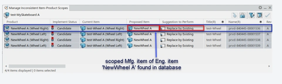 If we don’t have an existing Mfg. item scoped with the Eng. Item (NewWheel A) in the session or in database then we can replace the Mfg. item ‘test-Wheel A’ with new Mfg. item.