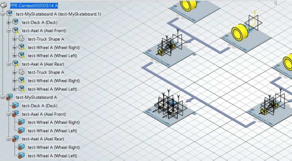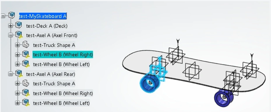 If we want to revise a wheel from this skateboard structure and give a different color to it, we can create a new revision of the existing wheel and replace the wheel in the skateboard structure by it's new revision. Please refer below image for updated Eng. structure.