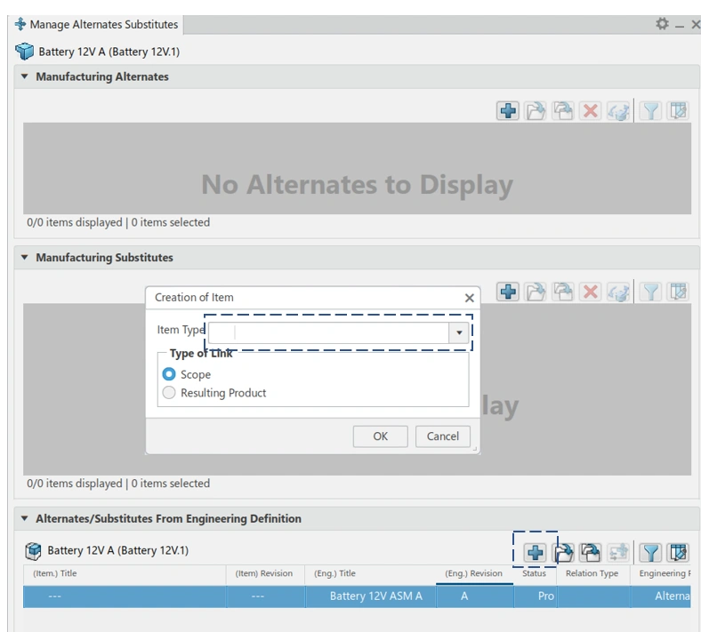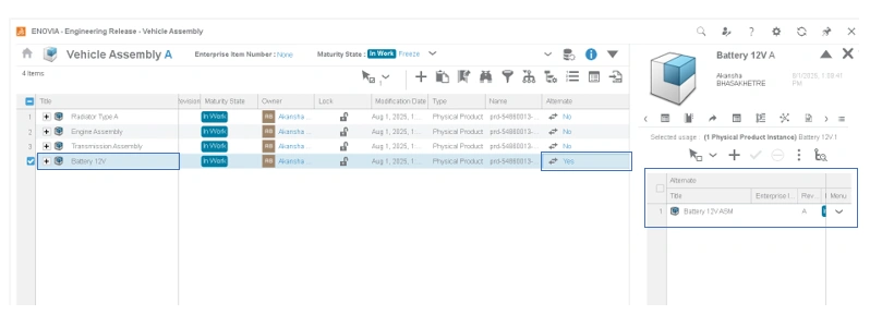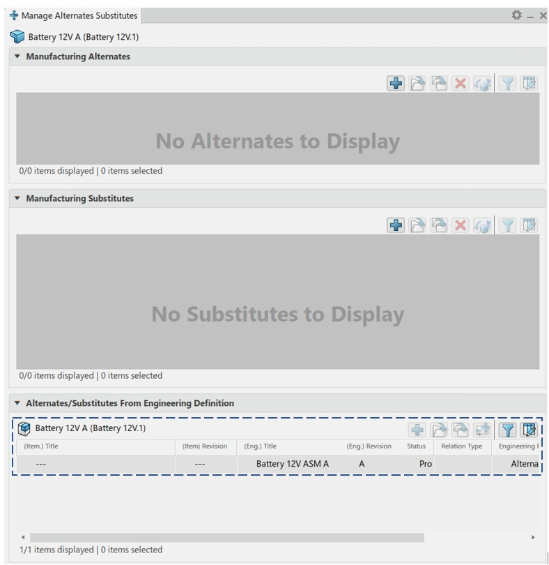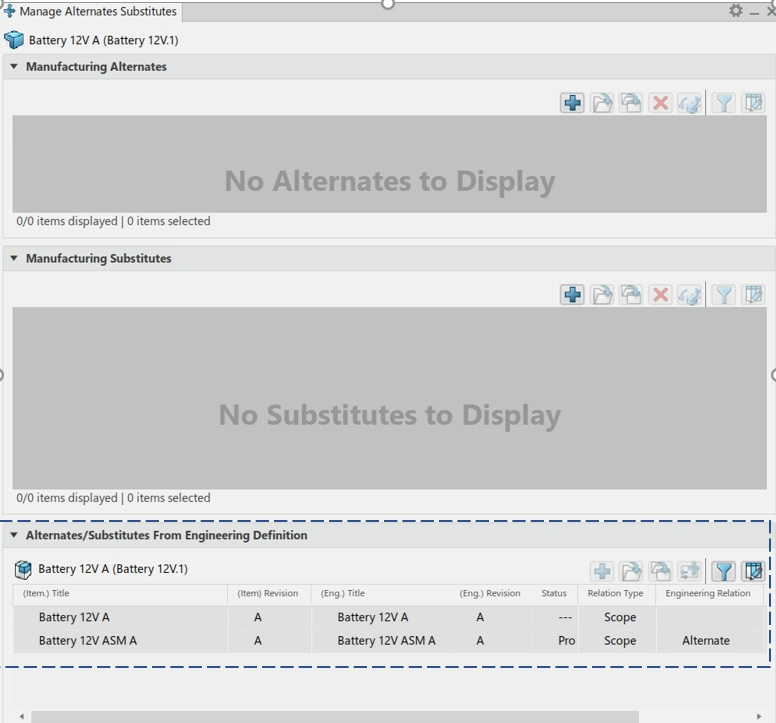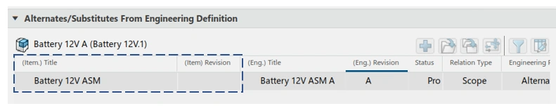 Defining alternates/substitutes (e.g., alternate battery or radiator) on EBOM.