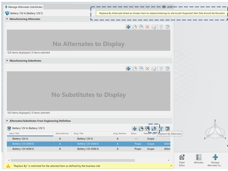 Now imagine you're in the 3DEXPERIENCE platform, and someone tries to replace a part with one of its alternates from the "Manage Alternates/Substitutes" panel.