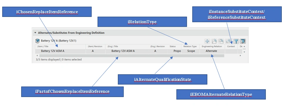 iEBOMAlternateRelationType | String | Tells the type of replacement (Alternate, Reference Substitute, Instance Substitute) |