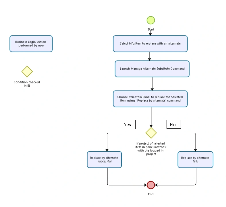 | Purpose | To determine whether the replacement of a manufactured item with an alternate is allowed Triggered when a user runs the Replace by Alternate command from the Manage Alternates/Substitutes panel |