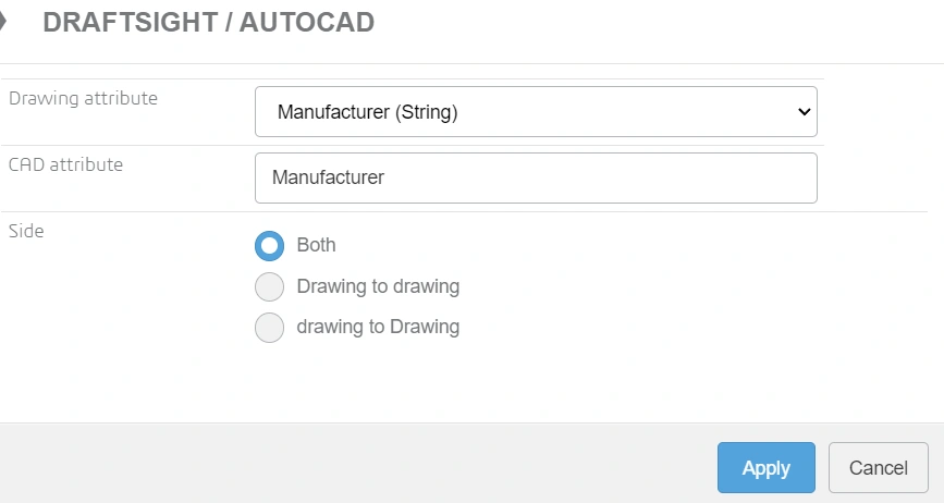 However when we save .dwg file to 3DXPERIENCE Platform this information will no longer linked to .dwg file if attributes are not mapped on a platform.  With attribute mapping capability we will be able to uni-directionally or bi-directionally link these properties so that you can change those properties from the 3DXPERIENCE platform and have that change updated in DraftSight drawing and vice versa.