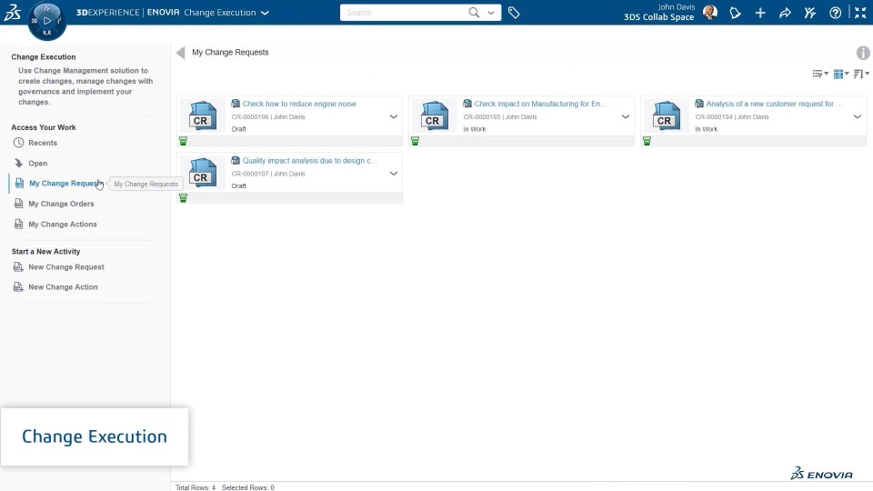 Change Execution | Change Execution lets you can create and manage change requests and change actions using features that are found in the other ENOVIA environments. |