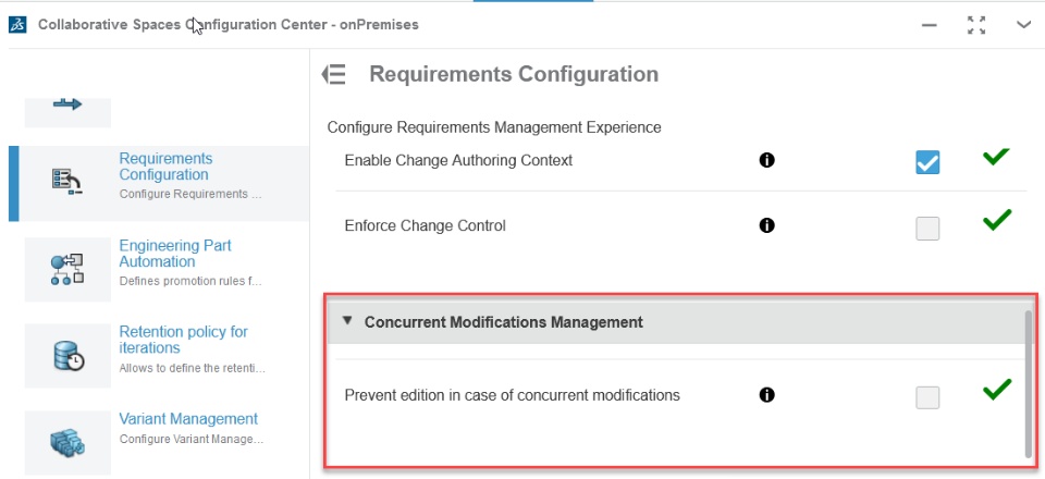 • A new admin setting is available now in the “Collaborative Spaces Configuration Center” (under “Requirements Configuration”), to prevent data loss when two users edit same requirement at the same time without using lock mechanism.