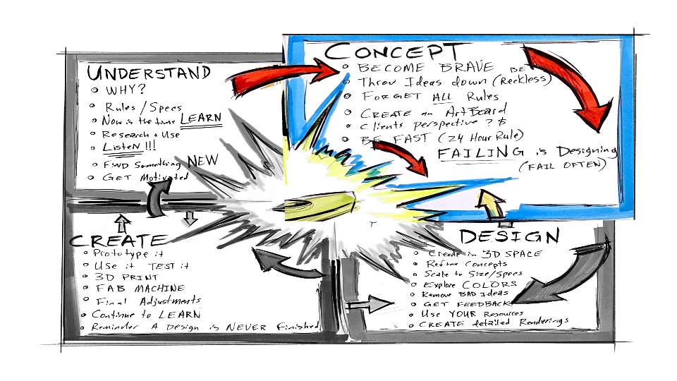 RELEASE THE BEAST! The below graphic is the best way to illustrate my process during PHASE 2. I like to allow myself to be manic. This is when ideas begin to explode from my mind onto paper. I sketch every thought… nothing is too crazy.