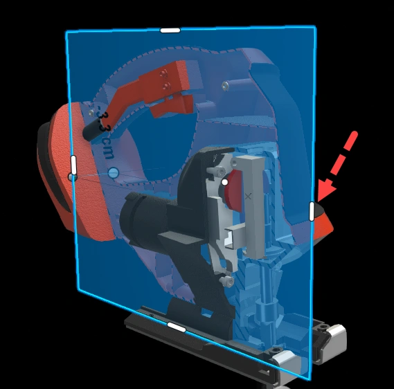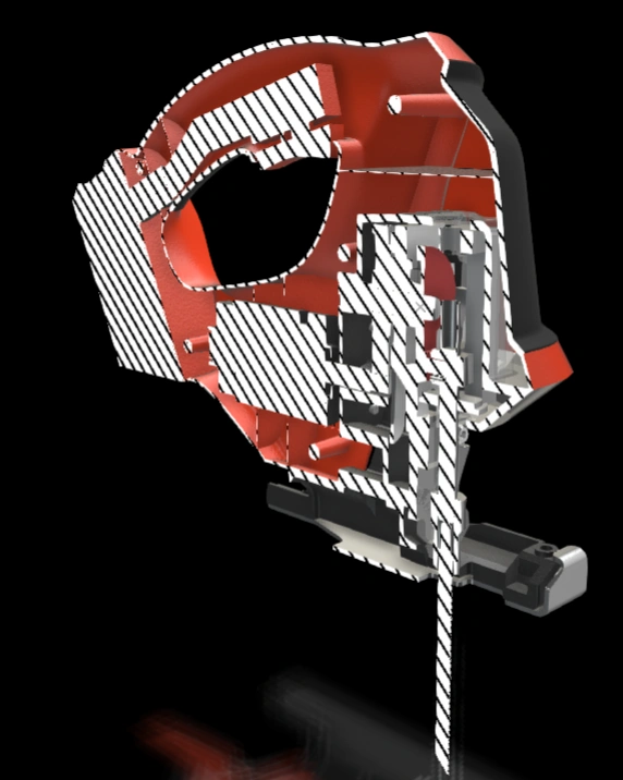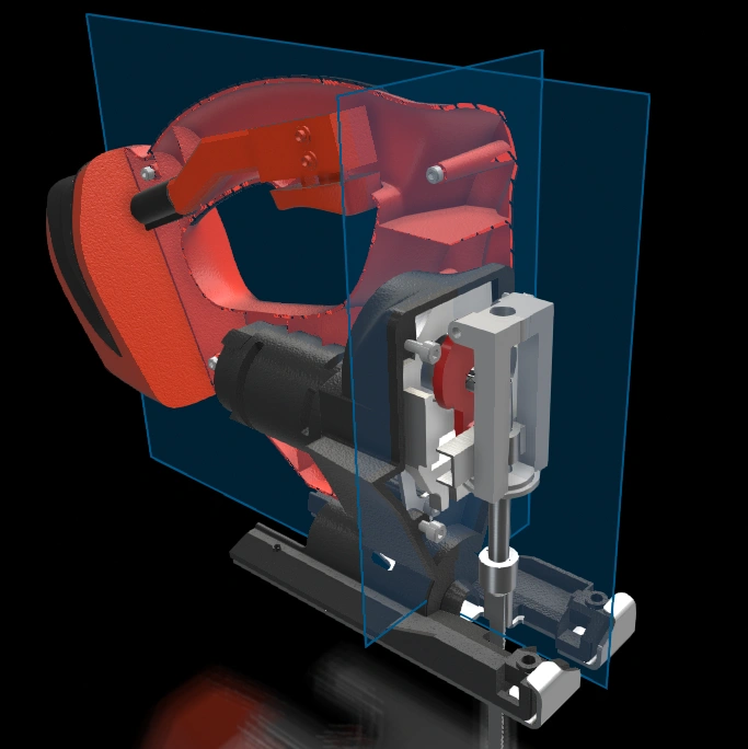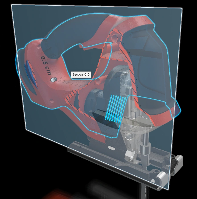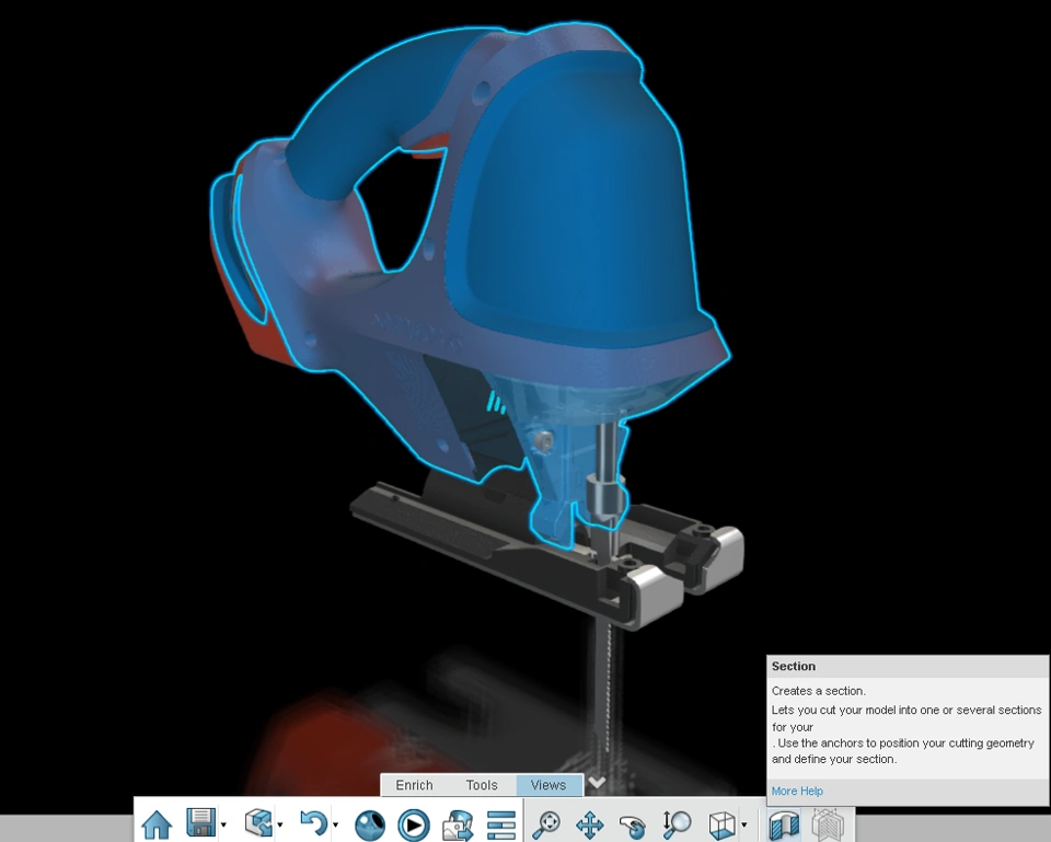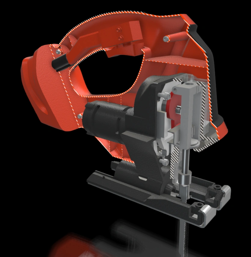 What if I'm curious about the inner workings of the jigsaw? How do we reveal internal structures clearly? Section views come handy here to cut out external components in xHighlight.