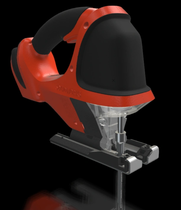 Product covers are commonly used to shield users from internal structures and to securely package all components together, such as the red containers or black handles on this jigsaw.