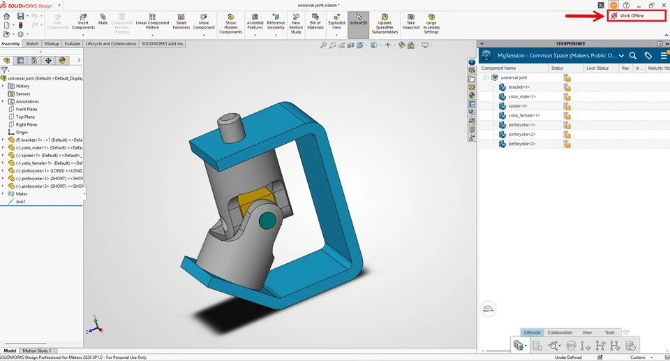 Optionally, you can start offline mode before the platform update for SOLIDWORKS Design or SOLIDWORKS Visualize, by clicking Work Offline.