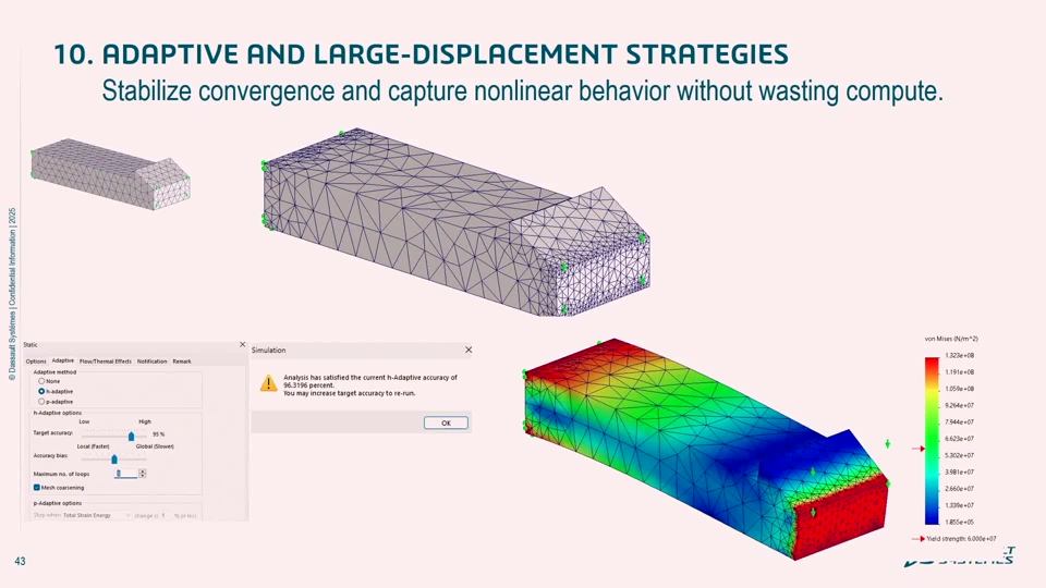 Running a simulation is not just about hitting Run. In design, what you see is what you get. In simulation, what you get is what you set up. In this session, we will reveal 20 essential Dos and Don’ts every analyst and designer should know to boost accuracy, save compute time, and avoid common pitfalls. We will cover: • Choosing the right mesh element type • Solver strategies that shorten run time instead of dragging it out • When to use shells, beams, and rigid connections effectively • Smart use of virtual bolts, pins, and contacts for realistic assemblies • Large displacement and adaptive methods and when they help • Loads, boundary conditions, and materials that actually reflect reality You will leave with a practical checklist that acts as your built-in validation system, one you can use immediately to safeguard every analysis you run in SOLIDWORKS or the 3DEXPERIENCE platform. Make your simulations faster, sharper, and more trustworthy. Do not just run. Run smart.