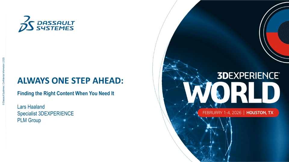 Struggling to find the right file when you need it most? In this session, learn how to make searching and structuring content in 3DEXPERIENCE fast and reliable. We’ll look at common pitfalls and share proven strategies from real customer onboardings across Scandinavia and the Baltics. See practical tips for using bookmarks, dashboards, and widgets to quickly access the content you need. Discover why some content is visible to you and not to others, how to troubleshoot access issues, and how to save and share searches with your colleagues. Whether you’re a new user or looking to sharpen your skills, you’ll leave with simple, memorable techniques to ensure you always find the right content—saving time and frustration in your daily work.