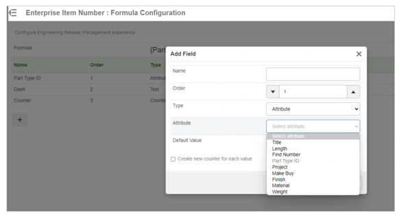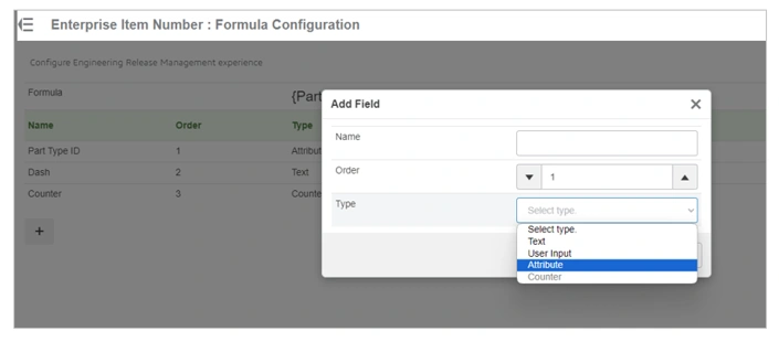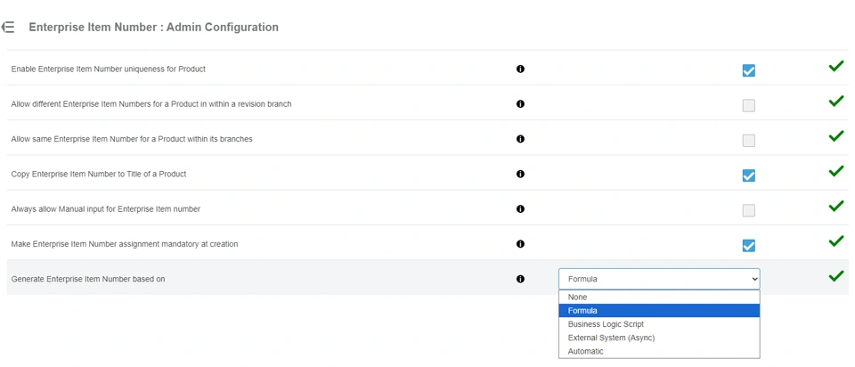 3. Enterprise Item Number : Admin Configuration enables an administrator to determine the method used to generate the EIN, for example by Formula, Business Logic Script, none (manual input). Formula is the method that offers the ability to incorporate attribute values into the EIN and will be selected for this example.