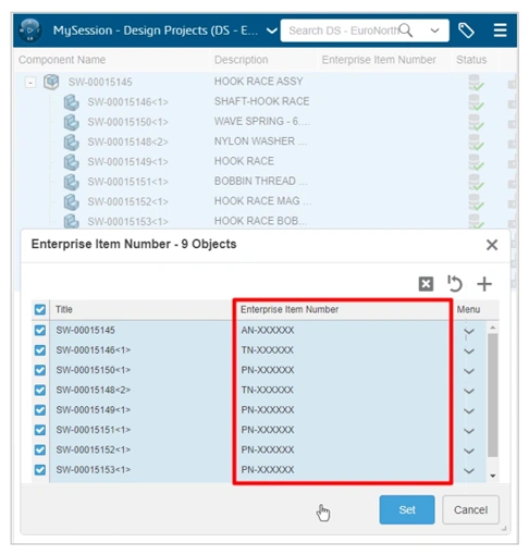 Selecting the Set button will apply the EIN to the selected components.
