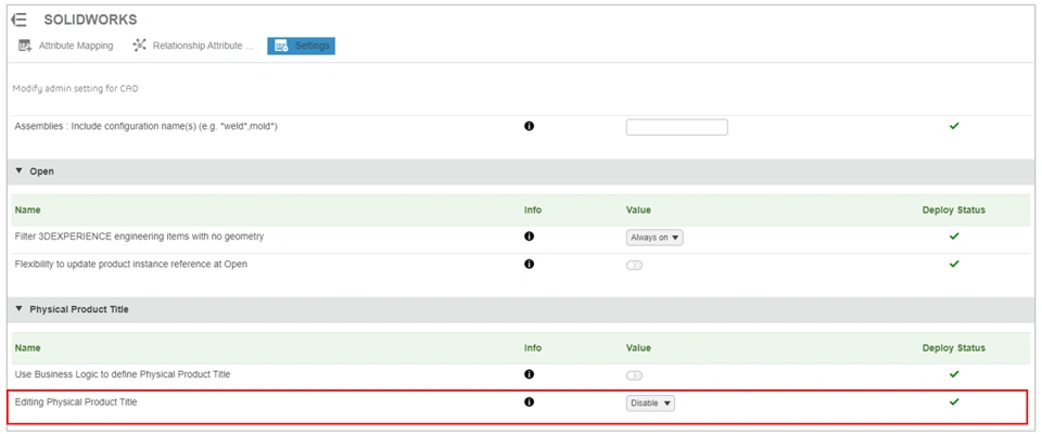 Tip: To avoid SOLIDWORKS users accidently overwriting the EIN in the Title field, it is recommended that editing of the Title in SOLIDWORKS is disabled. The admin option to disable the editing of a Physical Product Title option is located in SOLIDWORK settings in the Collaborative Spaces Configuration Center.