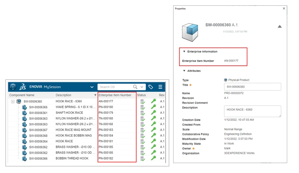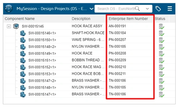 Once an EIN value has been assigned to a part or assembly, it can be viewed via the ENOVIA Properties dialogue, and by adding the EIN column to the SOLIDWORKS MySession task pane, and web apps (for example Bookmarks Editor and Product Explorer).