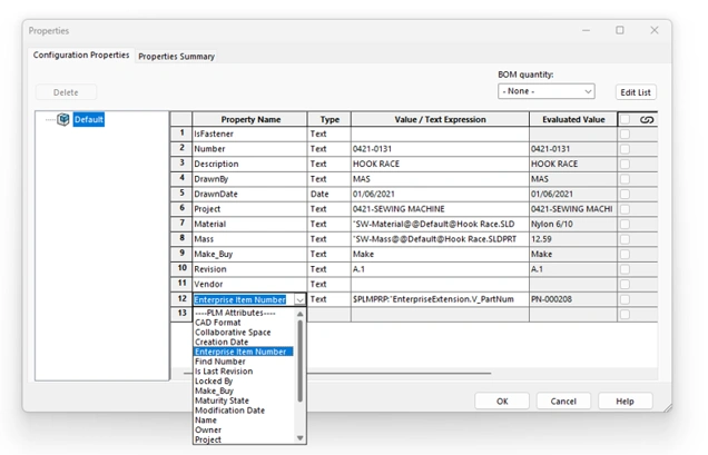 When SOLIDWORKS is connected to the 3DEXPERIENCE platform the Enterprise Item Number revision and lifecycle PLM properties are automatically made available to the user in the SOLIDWORKS properties dialogue of each part and assembly. When added to the Configuration Properties the EIN property will automatically populate with the resulting value when the EIN is assigned to the component.