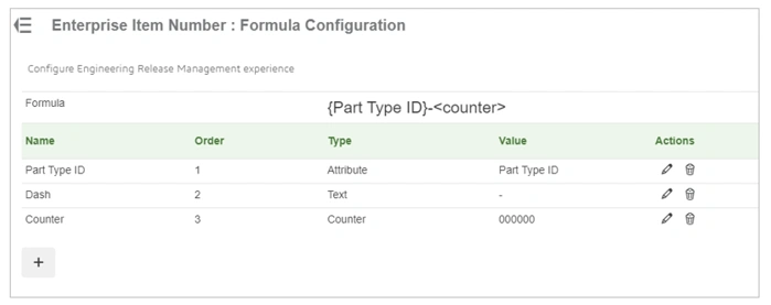 8. After the attribute field two more fields are added one as text “-“ and the other the counter to complete the EIN formula. At any time the platform administrator can add, edit or remove fields using the + icon and the icons in the Actions column.