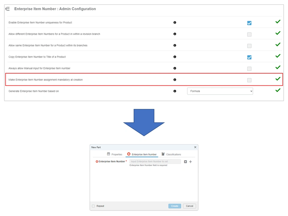 When the Enterprise Item Number Admin Creation option Make Enterprise Item Number assignment mandatory at creation is enabled, a user must assign an EIN before being able to create the part or assembly. The option is set by the platform administrator, individual users will not be able to change the setting at a local app level.
