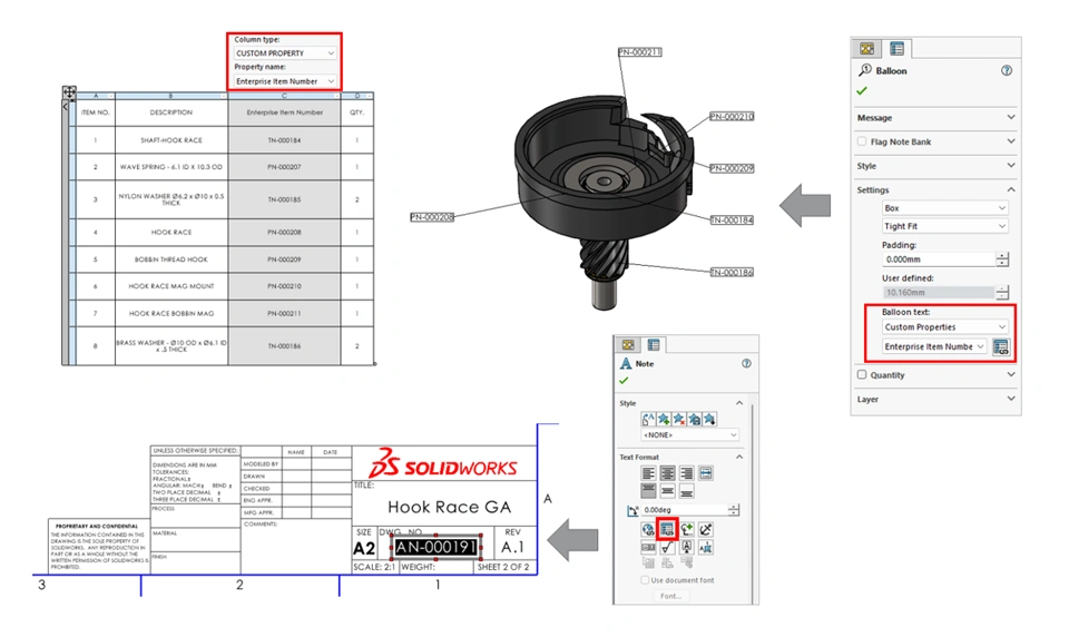 For quick and easy identification its common engineering practice to display the item number of a component on its associated drawing. The Enterprise Item Number attribute value can be added to a SOLIDWORKS drawing using the link to property option which is available for a range of annotation types e.g. Note, Balloon, Parts List etc.