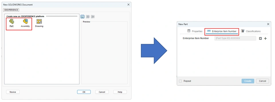 An EIN can be assigned to parts and assemblies; this can be done in SOLIDWORKS via the File -> New command, then selecting a template from the Create New on the 3DEXPERIENCE platform category,