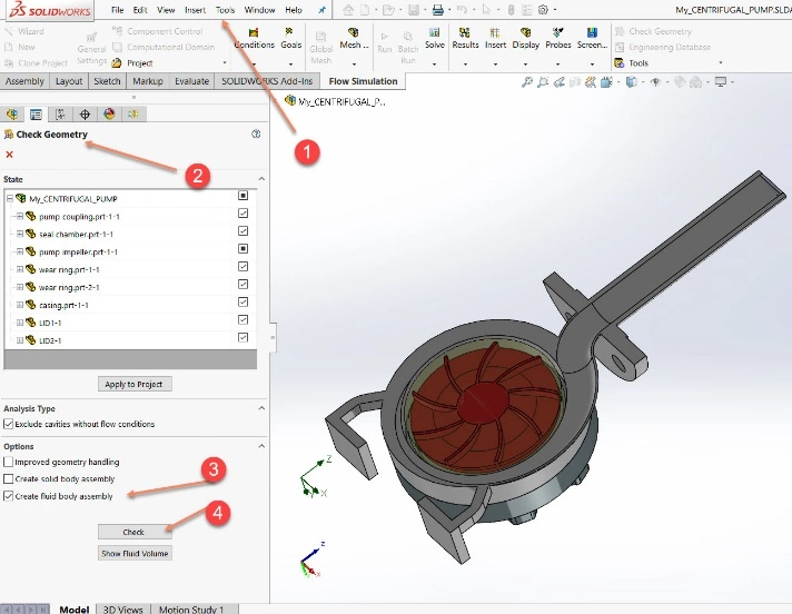 You can usually remove any thin gap, shaft, motor, filter, etc. In addition, you must strip down the CAD model by removing any screws, or other tiny features that the pump does not require. Some of the most significant complicating effects is the leakage. The Check Geometry Tool (Tools > Flow Simulation > Tools > Check Geometry”) is a valuable utility to verify the fluid domain. After generating the fluid domain, you can use the section view to examine it. This can save you time later.