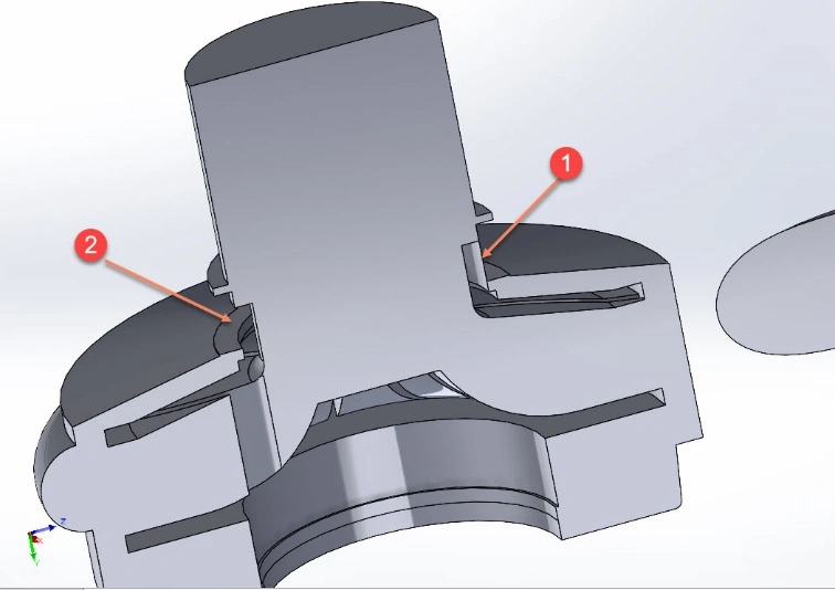 Make sure that the RR is not tangent to the entire impeller body. If the RR is tangent in some location, as shown by arrow #1 in the next image, it can lead to a Solver Abnormal Termination error at iteration 0, or SOLIDWORKS Flow Simulation fails to generate the mesh. In that case, redraw the RR and try again. A common error that users make when including the rotating region in an assembly, is to use a coincident mate between the top surface of the impeller and the top surface of the rotating region. As a best practice, use an offset distance instead of a coincident mate.