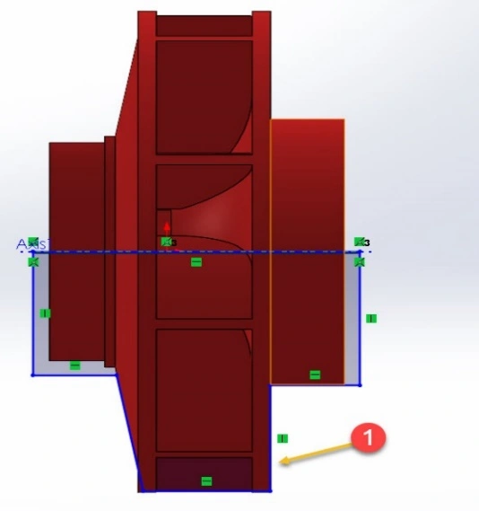 You need to draw the rotating region (RR) in the SOLIDWORKS application. The RR captures the rotation of the impeller, and the fluid that is in close proximity to the impeller. In a sketch, you can draw the rotating region outline and then use a revolve operation. When doing so, follow these guidelines: