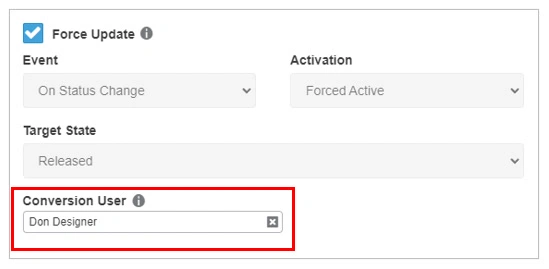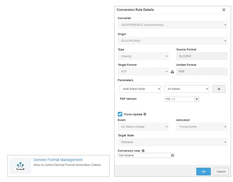 The Derived Format Converter app can be installed on either the SOLIDWORKS user's computer or another computer on the network designated by a platform administrator. When creating a derived format rule, the platform administrator can designate a specific user by whom the derived output jobs are processed.