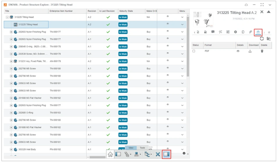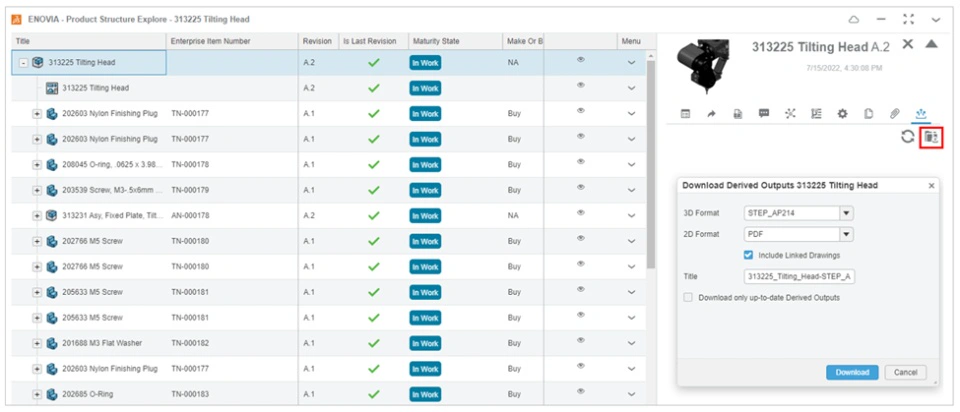 In the image below, a drawing in the product structure is selected with the derived output tab displayed in the side panel on the right.