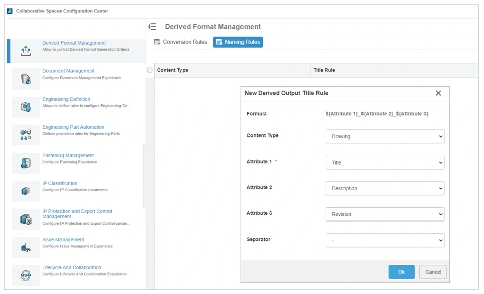 These preconfigured file naming rules will suit the requirements of some customers. However, in many cases, each customer will have a specific naming requirement that might include additional attribute information related to the design. Platform administrators can define their own file naming rule for documents, parts, and drawings. The option to define a naming rule is located on the Derived Format Management tab in the Collaborative Spaces Configuration Center widget.