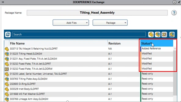 Once the recipient has finished making their changes to the design, they will use the Design Exchange Utility to create an updated version of the package file. This new version of the package file is used to import the files back into the 3DEXPERIENCE platform and, at the same time, compare the modifications against the frozen version of the design. The MySession status column indicates which components have been modified, and the modifications can either be rejected or accepted and merged with the original design.