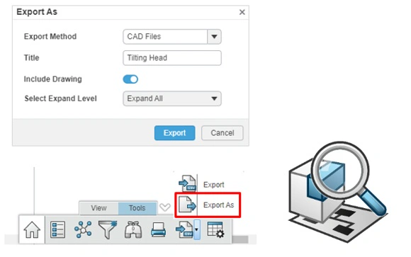 The resulting export operation will create a zip file containing the top-level assembly, its children, and related drawings (if selected).