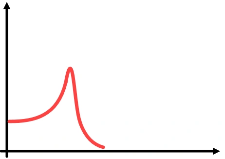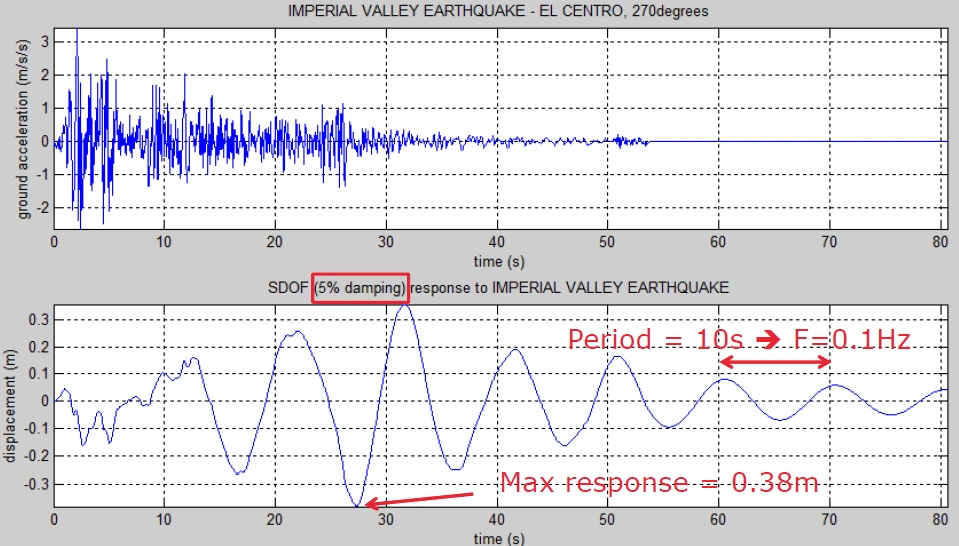 The input is a curve of maximum responses of single DOF systems of different natural frequencies to the same base motion. In practice, you would start with the transient acceleration loading as shown in Figure 5. This excitation would be applied onto a single degree of freedom oscillator that has some mass and stiffness that we know the natural frequency for. The peak response of this system is measured, which makes one data point for the response spectrum. This is repeated so that the peak response is plotted for a range of single degree of freedom systems so that you have the peak response as a function of natural frequency. An example single DOF system response to an excitation is shown in Figure 5.