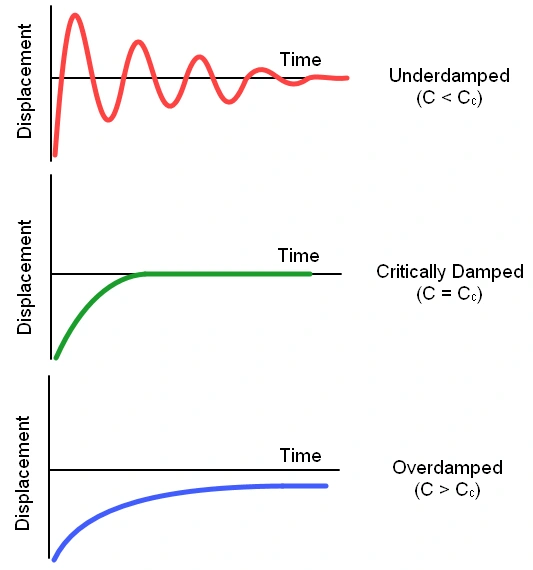 In a damped system, there is a critical damping value at which the system converges to zero in the minimum amount of time. If the system is underdamped, the system will oscillate with decreasing amplitude before returning to zero. Overdamped systems will not exhibit oscillations, but takes longer than the optimal time to return to zero. Figure 3 depicts that in both the underdamped and overdamped cases, the system takes longer to reach equilibrium than the critically damped system.