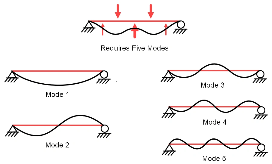 A dynamic response involving deformation is normally oscillatory in nature, in which the structure vibrates about a stable equilibrium configuration. The total response of a structure using this type of analysis is approximated by the modal superposition method. Therefore, it is important that all modes that contribute to the deformation shape of the structure are considered in the analysis. Figure 1 shows a case in that should include at least five modes to characterize the deformation shape.