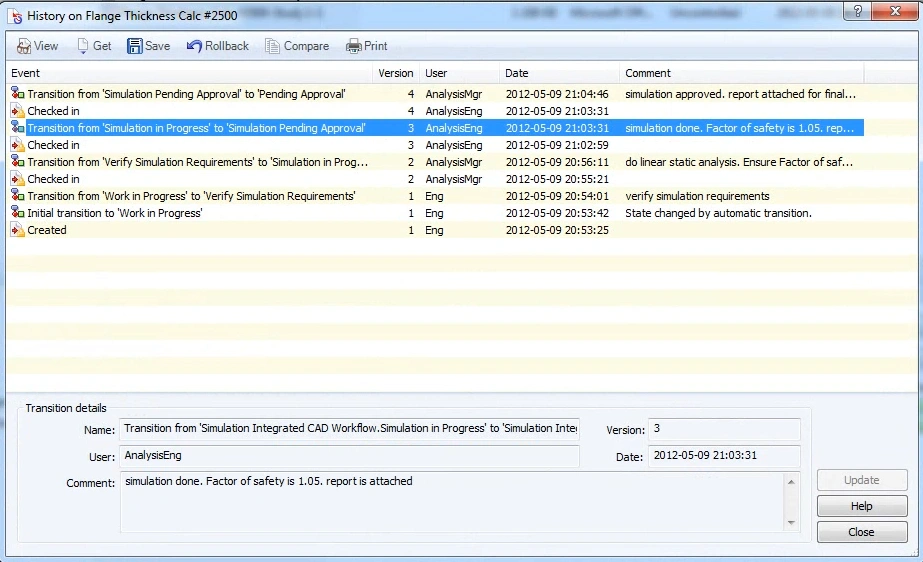 Step 6: If all requirements are complete, the simulation manager signs and approves the simulation work and submits the CAD file and simulation data along with any supporting documentation to the main engineering workflow. This automatically sends a notification to the appropriate person (such as the engineering manager) for final design approval. Figure 15 shows the last stage of the simulation workflow where the simulation manager sets the workflow status to “Simulation Approved”.