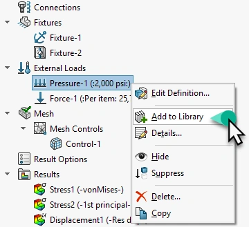- The simulation input such as a load or fixture is first saved to a folder that exists in the Analysis Library by using the Add to Library option.