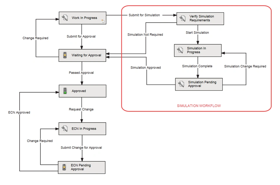The simulation workflow now becomes a branch of the main engineering workflow. The result of this being that we can now not only manage, but also share simulation methods across cross-functional departments. This leads to improvements in reliability, consistency, and communication. Figure 5 illustrates a skeleton of how an entire engineering workflow with the integrated simulation workflow might look. Figure 6 illustrates a close up detail on the simulation workflow.