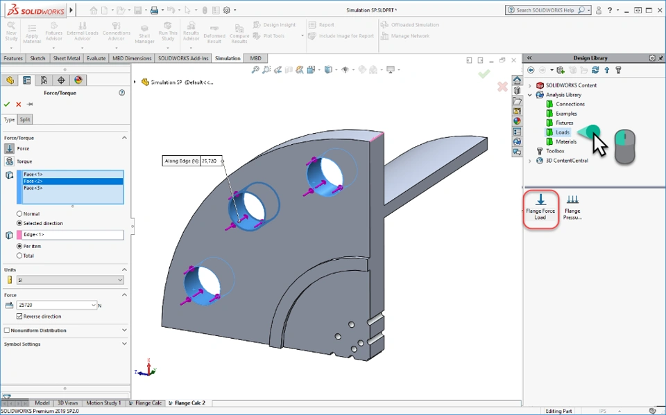 - You can simply drag the analysis library feature and drop it into the CAD graphics window. The appropriate properties dialog box then opens with a pre-defined load and all that needs to be done is to complete the geometry selections. Figure 12 shows an example of the application of a force load analysis library feature on a flange design.