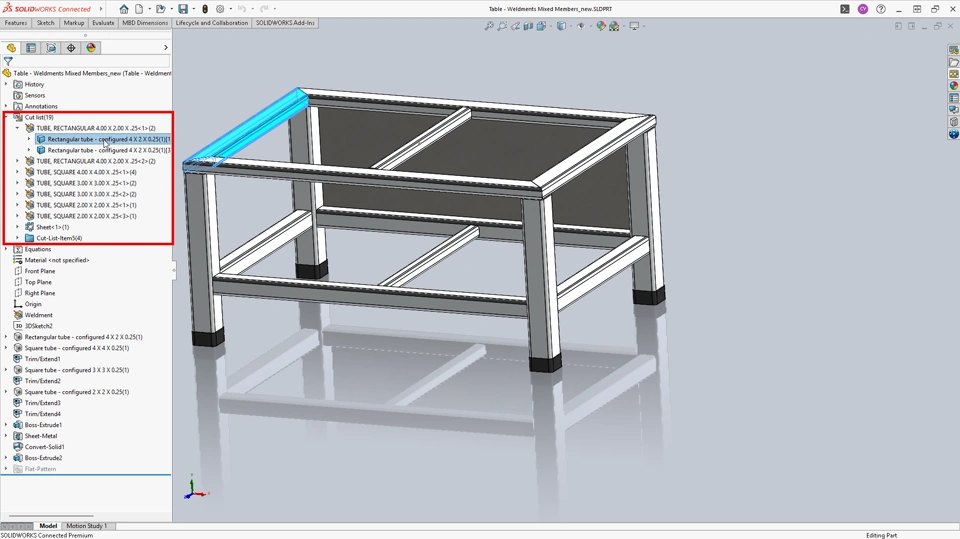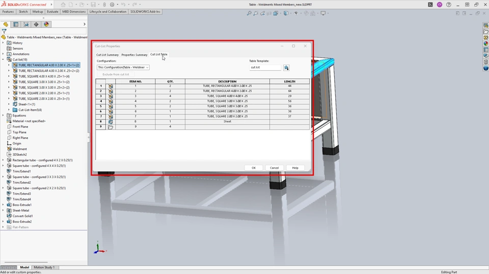 Once the geometry is complete, it must be prepared for production. The Cut List feature in SOLIDWORKS Design organizes bodies within a weldment part. It identifies groups of identical members, applies properties such as material and length, and creates a cut list table for communication with downstream teams.