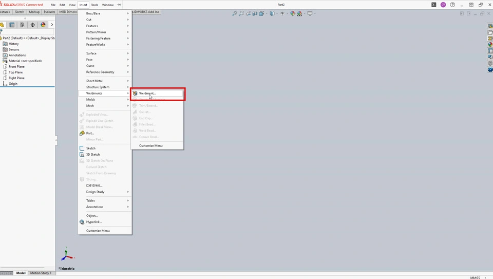 With the file opened in a SOLIDWORKS session, go to Insert > Weldment > Weldment to add the weldment feature.