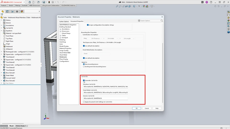 Cut List IDs are defined in Tools > Options > Document Properties > Weldments. By standard configuration, SOLIDWORKS Design uses the following properties when generating IDs: