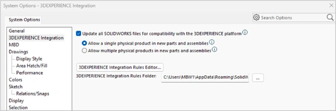 Set the SOLIDWORKS 3DEXPERIENCE Integration option to Allow a single physical product in new parts and assemblies. This setting will ensure that each SOLIDWORKS file will be represented by only one physical product in the 3DEXPERIENCE platform.
