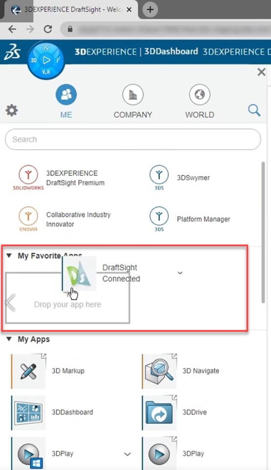 6. To add it as a favorite, click on the Compass and scroll down to find the DraftSight app under My Apps. Drag and drop it to the My Favorite Apps section for easy access.