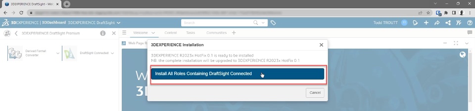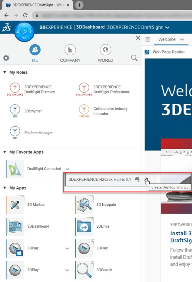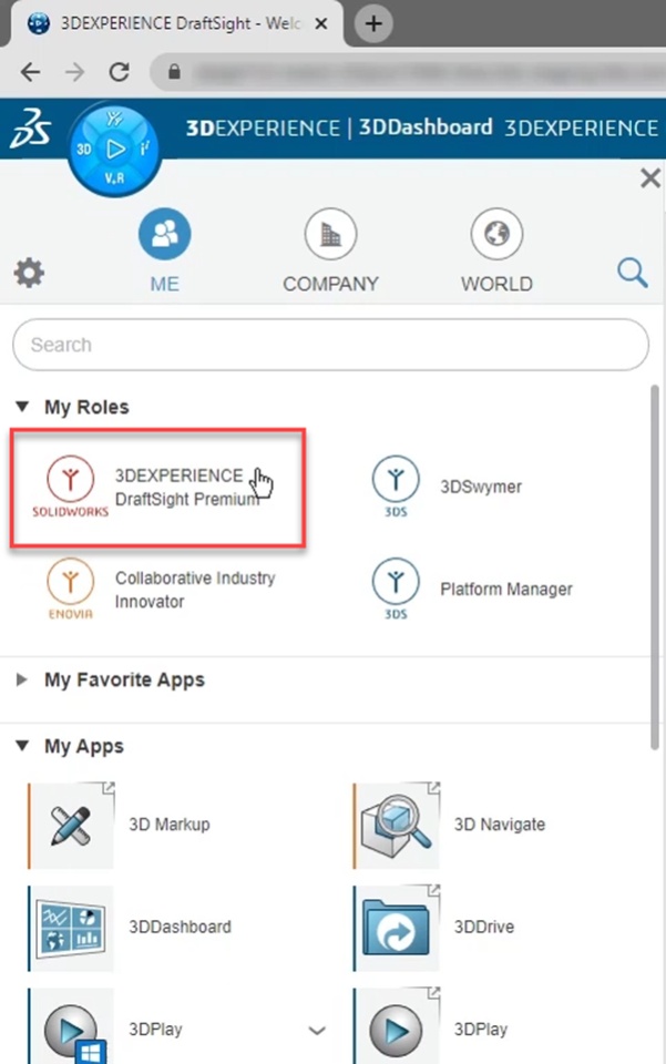 2. To install DraftSight Connected, click on the Compass to show your Roles and Apps. Under My Roles, select DraftSight Premium and then click on the DraftSight app.